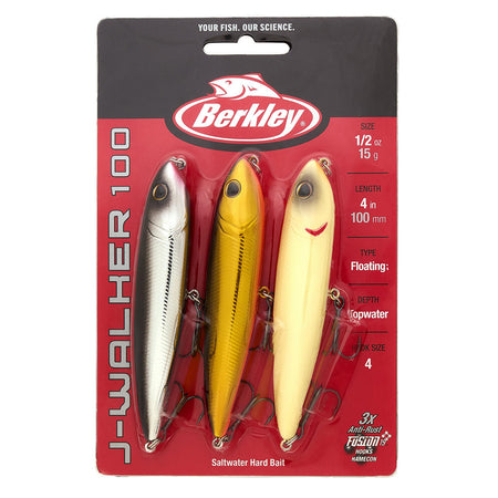 Berkley® combined the best of the renowned Berkley® J-Walker in a convenient 3-lure pro pack. The J-Walker features a sleek, tail-weighted design that has been refined to provide casting distances. The hydrodynamic shape, precision balance point, and resting position allow for an easy walk-the-dog action that has been proven on the water. Topped off with Fusion19TM hooks, Berkley® J-Walkers are sure to impress anglers of all skill levels.