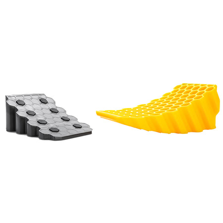 The Camco Curved Leveler is a simple way to level your vehicle by giving a tire up to 4-inches of extra lift. The honeycomb design makes the leveler lightweight but durable. The drive-on curved design allows you to only drive on to as much height as needed, then chock the leveler at the exact right height. The included chock has non-slip rubber grippers on the bottom. Patented.