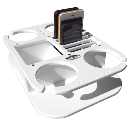 Have phones? Have friends with phones? The BH-4Cell can help! Holds up to five phones (fits phones with waterproof cases), also can hold four drinks. Has a storage box for all the other loose items that end up everywhere. Overall dimensions: 9 3/4" x 14" x 3". Box Dimensions: 4" x 4 1/4" x 3" deep and will fit everything from wallet to cameras to sunscreen, etc. 3.5" Diameter cup hole size Comes with four suction cups, or can be permanently mounted. Made out of Starboard, lifetime warranty. Made in America, tested on the water!