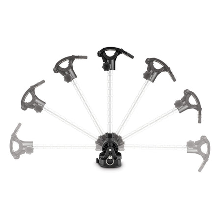 Reduces bounce on bow-mount trolling motors. Equipped with a low profile mounting base that allows the stabilizer to be easily removed. The pivoting arm can be folded down when not in use.