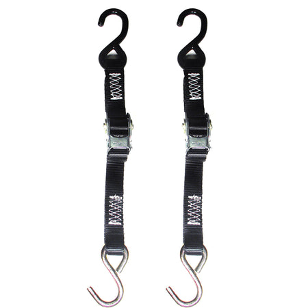 This 1" x 3' strong small boat transom tie-down features an innovative buckle with smooth roller action. Ideal for boats 17' or smaller. This heavy duty quick tite transom tie-down is constructed with a high carbon steel buckle. It features American made heavy vinyl coated top hook, zinc plated bottom hook, and heavy duty polypropylene webbing.