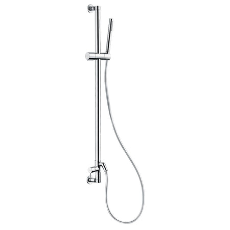 This unique sliding rail shower system combines a 28-inch-long shower rail with an integrated mixer, hose, and shower handle all in one. Installation requires the hot and cold water supplies to be connected to the top and bottom mounting system of the rail.