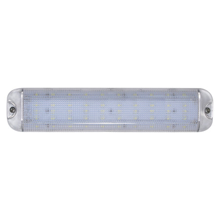 The E-500 is a multi-voltage (12/24V), surface-mounted engine room light that offers an impact-resistant PC lens, which allows the wires to exit straight back through the mounting surface or routed to the side through the end cap. Featuring a total of 50 LEDs, this fixture produces an impressive 1,520 lumens, comparable to a 220W standard bulb. Drawing only 1.5 amps (12V), this fixture is often used in multiple quantities to eliminate any dark spots in the engine room.
