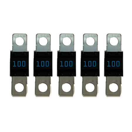 Victron Energy's MIDI fuses are essentially a smaller version of the MEGA fuses and are known to have low voltage drop and cold resistance. This particular pack of Victron MIDI fuses contains five 100-amp fuses.
